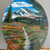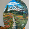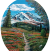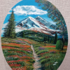 A bright riot of life on an oval canvas! Oil and acrylic intertwine, creating an idyllic landscape: a mountain crowned with a fluffy cloud, immersed in the greenery of blooming plants. In the midst of this beauty, a stone path winds, beckoning into the distance, into unknown realms. The clear, warm weather seems to permeate the painting, filling it with a sense of serenity and a call to adventure.
