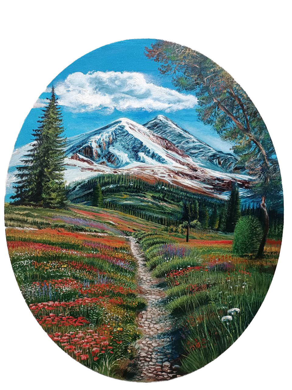 Aslanbek Alkatsev’s painting “Mountain Landscape” presents an idyllic view in which the artist has captured the beauty and majesty of mountain nature. The composition, executed in an oval format, gives the work a special intimacy and coziness. The artist uses bright, saturated colors and a detailed painting style to create an atmosphere of freshness, tranquility, and admiration for the power and beauty of the surrounding world. It is not just an image of a landscape, but like a visual embodiment of harmony, peace, and the aspiration for the sublime that a person experiences when contemplating the greatness of the mountains.
