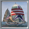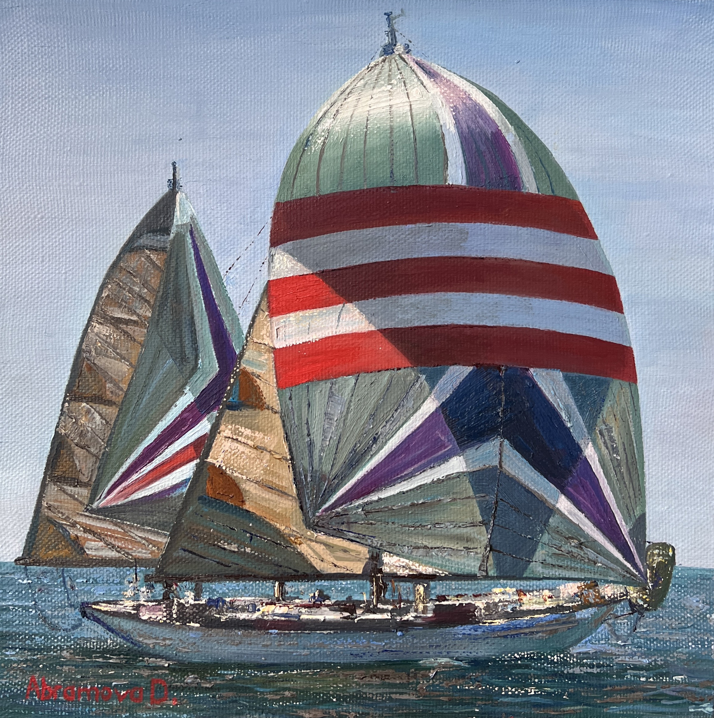 Darina Abramova’s painting «Norwegian sails» is a vivid embodiment of maritime romance and the spirit of travel. The artist skillfully conveys the grandeur of the sailing vessel, whose bright, geometrically complex sails become the main focal point of the composition. The combination of red, white, purple, and deep blue shades on the sailcloth creates a dynamic rhythm, as if governed by an invisible Norwegian wind.