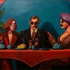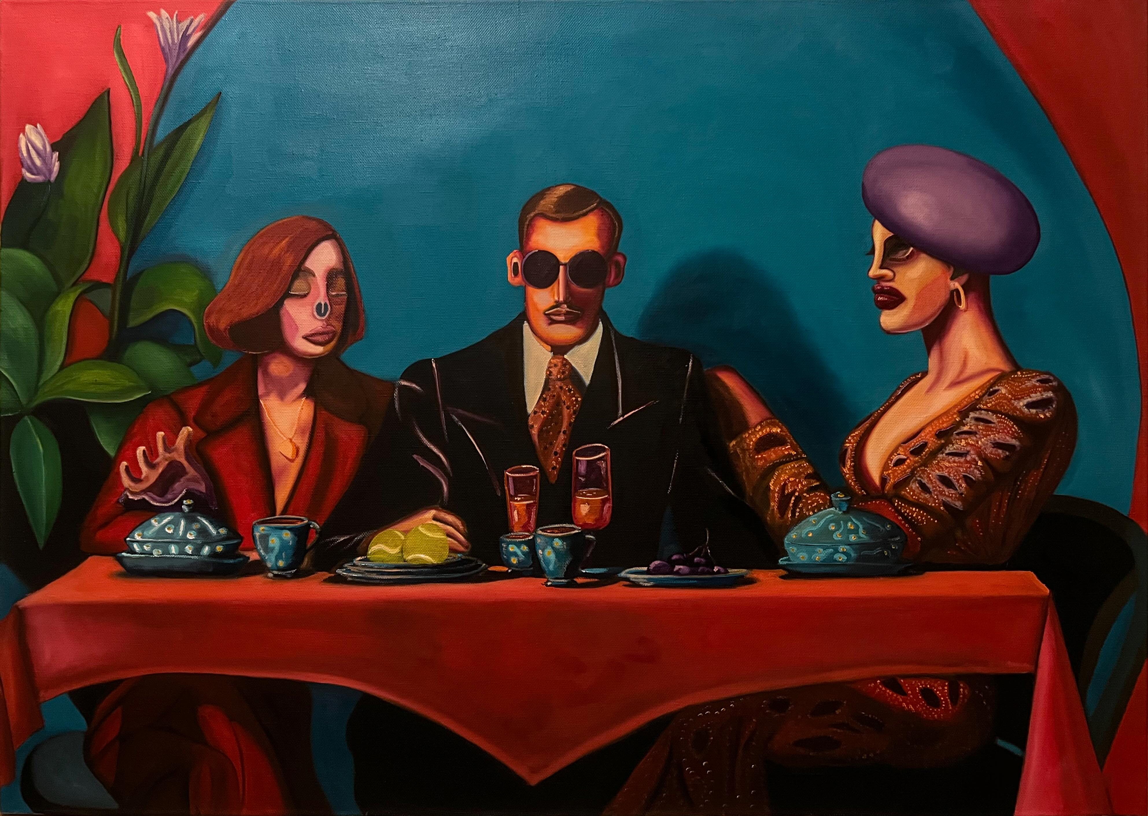 Pavel Klimov’s painting presents a stylized genre scene filled with tension and ambiguity, in which the artist explores the themes of relationships, rivalry, and hidden motives. He uses a saturated color palette and deformed figures to create an atmosphere of anxiety, беспокойства, and psychological discomfort. It is not just an image of a group of people at a table, but like a visual commentary on complex social and personal interactions, where secret desires and a hidden struggle are hidden beneath a mask of decency.