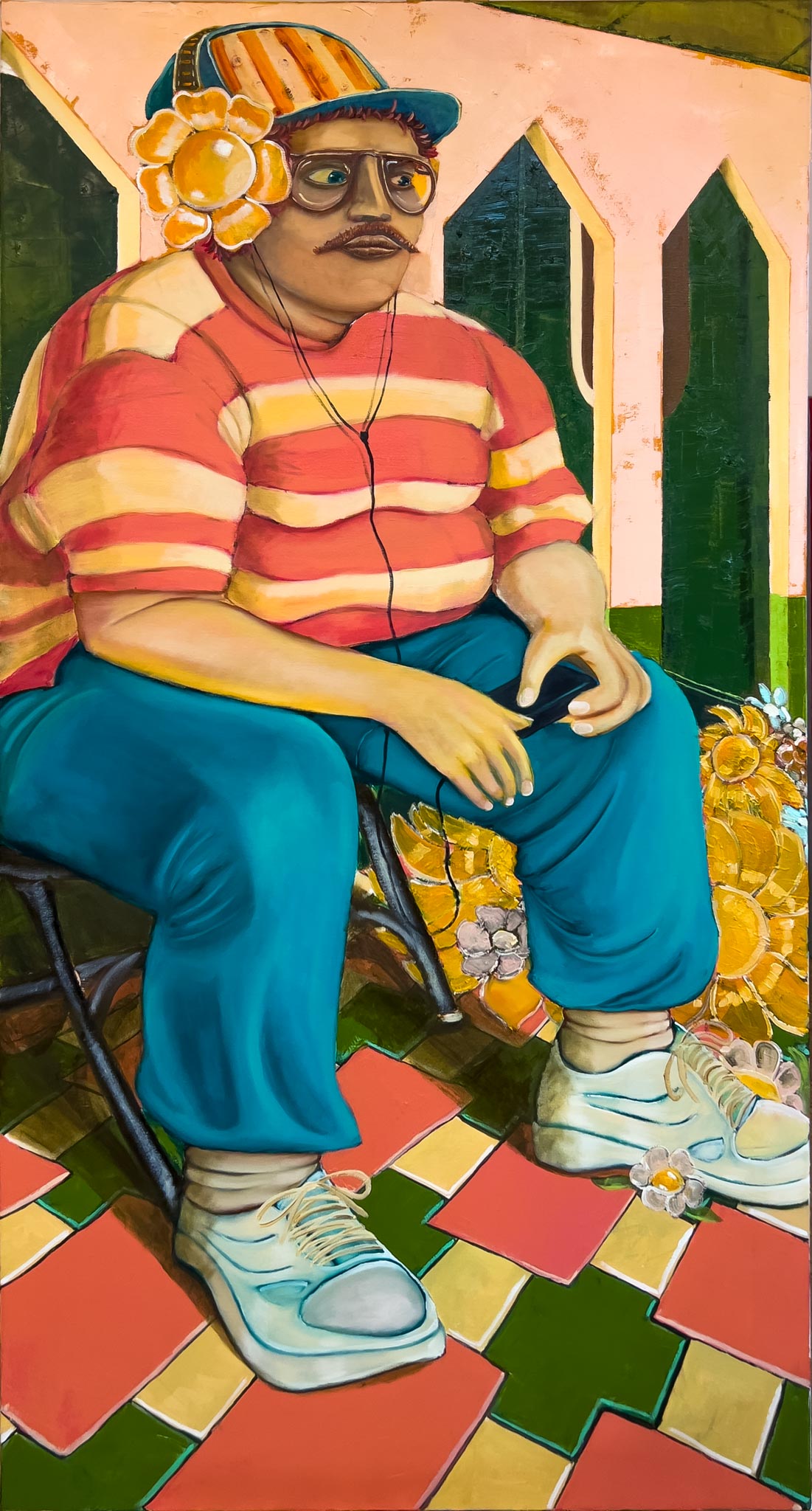 A special feature of the image is his clothing and accessories. The bright striped shirt, sports cap, and massive headphones create a sense of extravagance and some absurdity. The headphones seem to be a symbol of escaping from reality, immersing yourself in the world of music and fantasies.