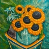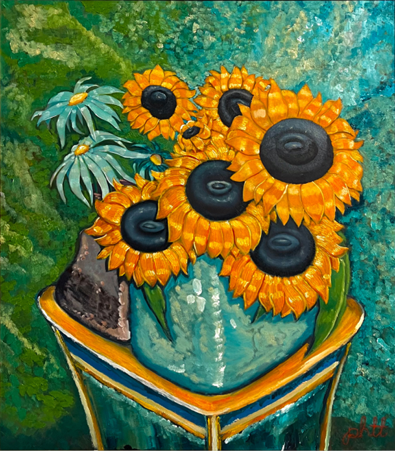 At the center of attention of the painting is a lush bouquet of sunflowers towering over a small stand. The flowers, like bright suns, attract the eye and fill the space with energy. The artist uses saturated yellow and orange tones to convey the warmth, radiance, and cheerfulness of sunflowers. Their petals, executed in the technique of expressive brushstrokes, seem alive and mobile, as if they are reaching for the sun, trying to catch every ray of it.