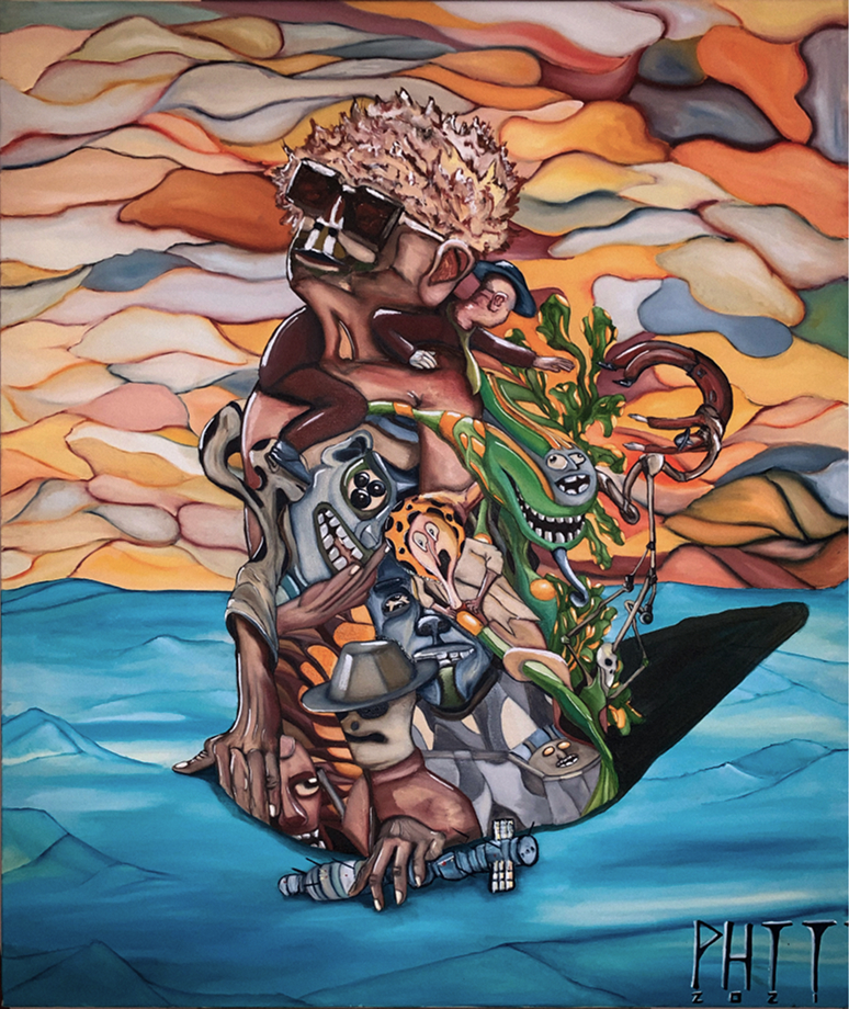 Pavel Klimov’s painting “Inner Mongolia” is a surreal composition, full of symbolism and enigmatic images, in which the artist explores the theme of the inner world of man, his experiences, fears, and dreams. He uses a bright, saturated, yet dissonant color palette and deformed forms to create an atmosphere of anxiety, tension, and some absurdity characteristic of the world of the subconscious. It is not just an image of a man, but like a visual embodiment of the chaotic and multifaceted nature of the human psyche.