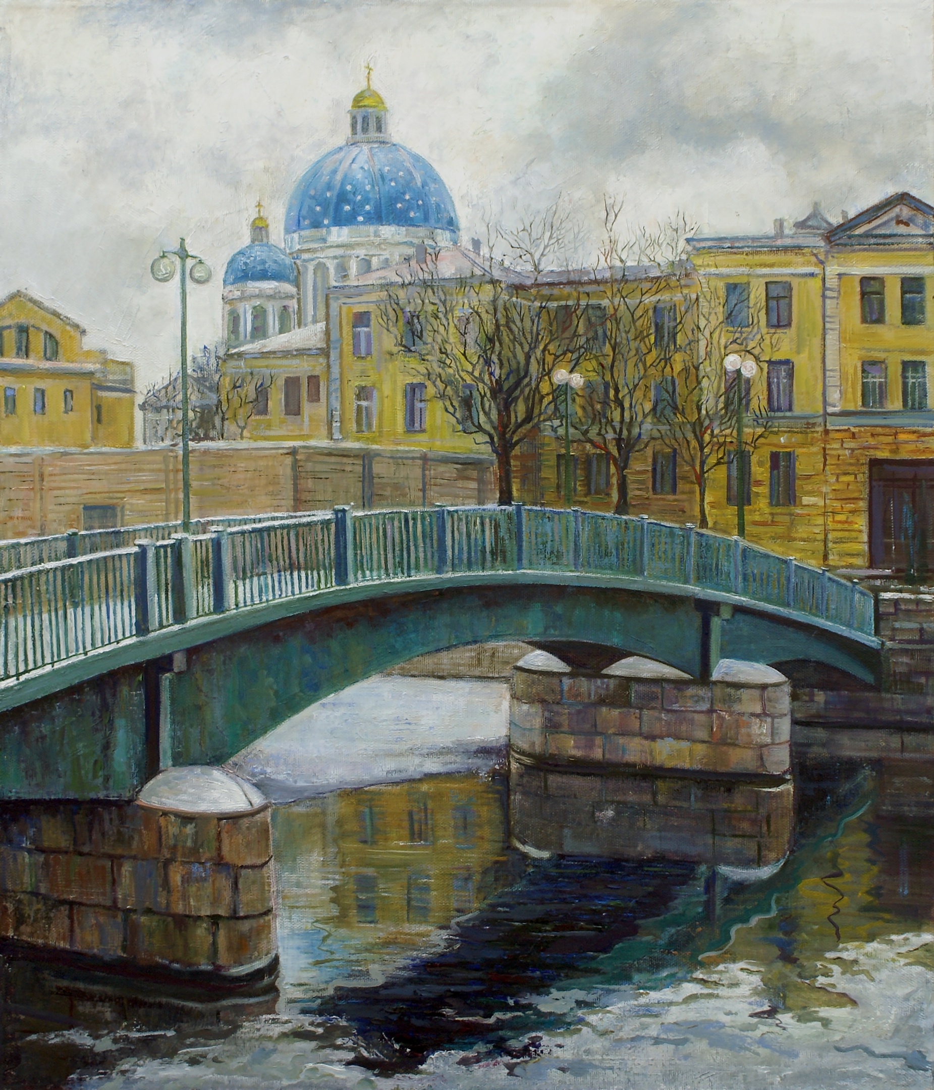 At the center of attention of the painting is a small bridge spanning the canal. Its graceful arch, executed in gray-blue tones, creates a feeling of lightness and airiness. The bridge seems to be a connecting link between different parts of the city, uniting the past and present, reality and dream. It invites the viewer to embark on a journey through Saint Petersburg, to discover its beauty and secrets.