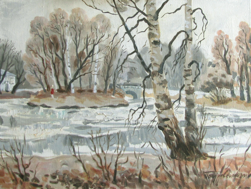 Maxim Ponurovsky’s painting “Landscape with Birch” presents a lyrical and pensive winter landscape in which the artist sings the praises of Russian nature, its silence, tranquility, and resilience in the face of harsh weather conditions. Using a muted color palette and the watercolor technique, he creates an atmosphere of calmness, contemplation, and light melancholy characteristic of the Russian winter landscape. It is not just an image of trees, a lake, and the sky, but like a visual ode to the Russian soul, its connection with its native land, and its ability to find beauty and harmony in the simplest and most ordinary things.