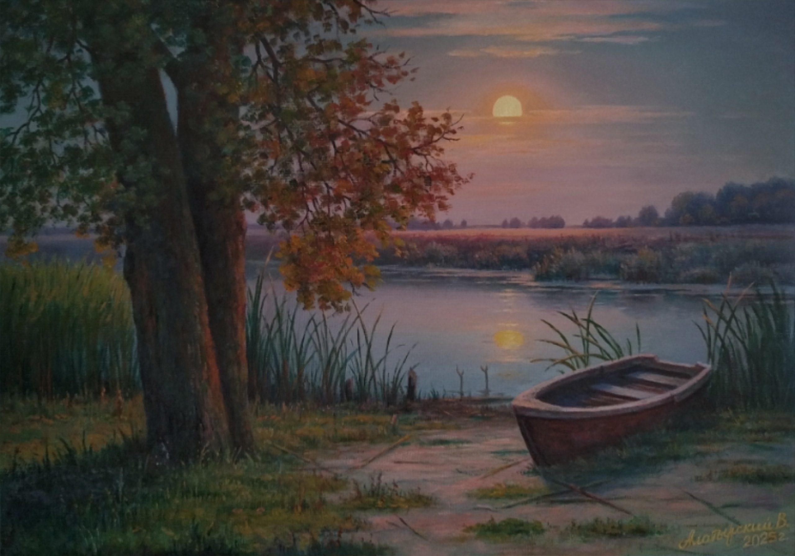 At the center of the composition is the river, its dark waters, like a mirror, reflect the barely breaking moonlight. On the shore, near the very water, nestled an old boat. It seems to have not seen fishermen for a long time, overgrown with grass and moss, but still retains memories of past days, of the splash of oars and quiet conversations. The boat is a symbol of solitude, reflection, and inner freedom that can be found alone with nature.