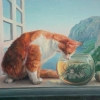 The painting centers on a ginger cat standing on a windowsill, peering intently into the aquarium. His wary and curious pose expresses an interest in what's happening within. The cat seems to symbolize freedom, independence, and a thirst for adventure, eagerly peering into a world inaccessible to him. The painting's defining feature is the aquarium containing the mermaid. The mermaid seems to symbolize imprisonment, limitation, and the loss of freedom. Her sad face and upward gaze express a longing for the boundless expanse of the ocean and a yearning for freedom. The aquarium seems to be a cage, depriving the mermaid of the opportunity to live a full life and realize her dreams.