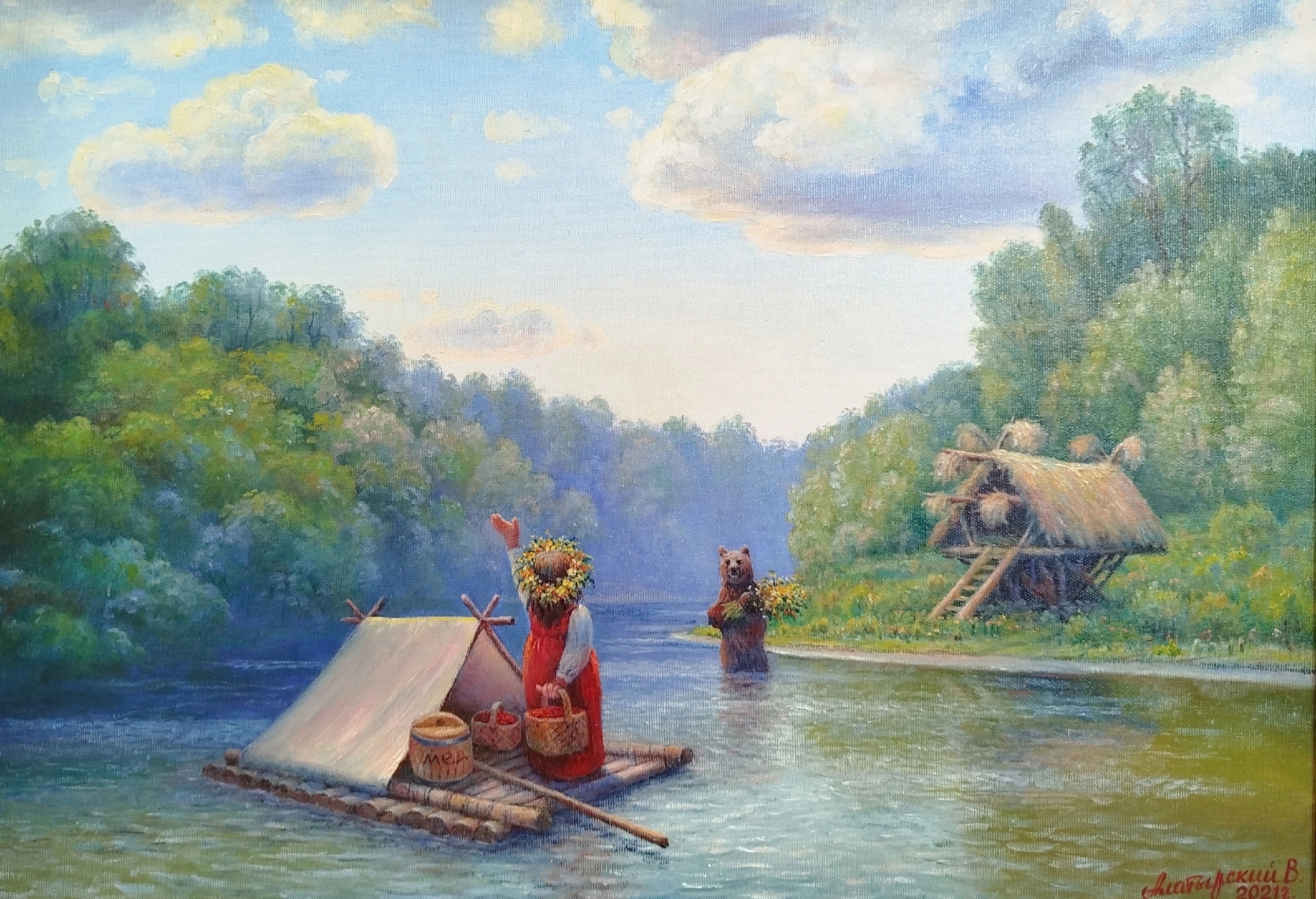 A special feature of the painting is the image of a raft floating on the river. On the raft stands a woman who seems to be heading towards a bear standing in the water. She seems to be a symbol of goodness, care, and selflessness, readiness to share with her neighbor everything she has.