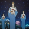 At the center of the painting are three figures, dressed in light robes, holding burning candles in their hands. Their faces, appearing ethereal and transparent, seem to embody the souls of fallen soldiers who have come to honor the memory of their comrades. The figures seem to symbolize the connection between generations, the continuity of memory, and the eternal gratitude of descendants.