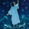The background of the painting is a dark space strewn with stars. The stars seem to symbolize infinity, eternity, and the mysterious world of space. They create a sense of depth and mystery, and emphasize the loneliness and courage of the child striving for his goal.