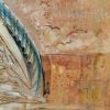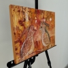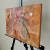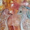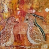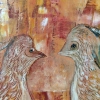 На полотне изображены две стилизованные птицы, расположенные близко друг к другу. Их головы наклонены в профиль, что создает впечатление сосредоточенного диалога. Фигуры птиц написаны в теплых тонах — бежевом, охристом и рыжевато-коричневом, что придает им сходство с осенней листвой или песком. Художник использует технику наложения мазков, чтобы передать текстуру оперения.