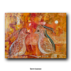Фон картины выполнен в доминирующих оттенках оранжевого, красного и жёлтого, что создаёт ощущение тёплого заката или мягкого золотистого освещения. В верхней части фона едва заметен светлый круг, который можно интерпретировать как солнце или луну, безмолвно наблюдающую за этой встречей.