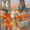 Сквозь цветовой вихрь проступают вертикальные формы, напоминающие скалы или деревья, которые поднимаются над землей и растворяются в свете. У этих форм нет четких контуров, они существуют как часть общего цветового потока.