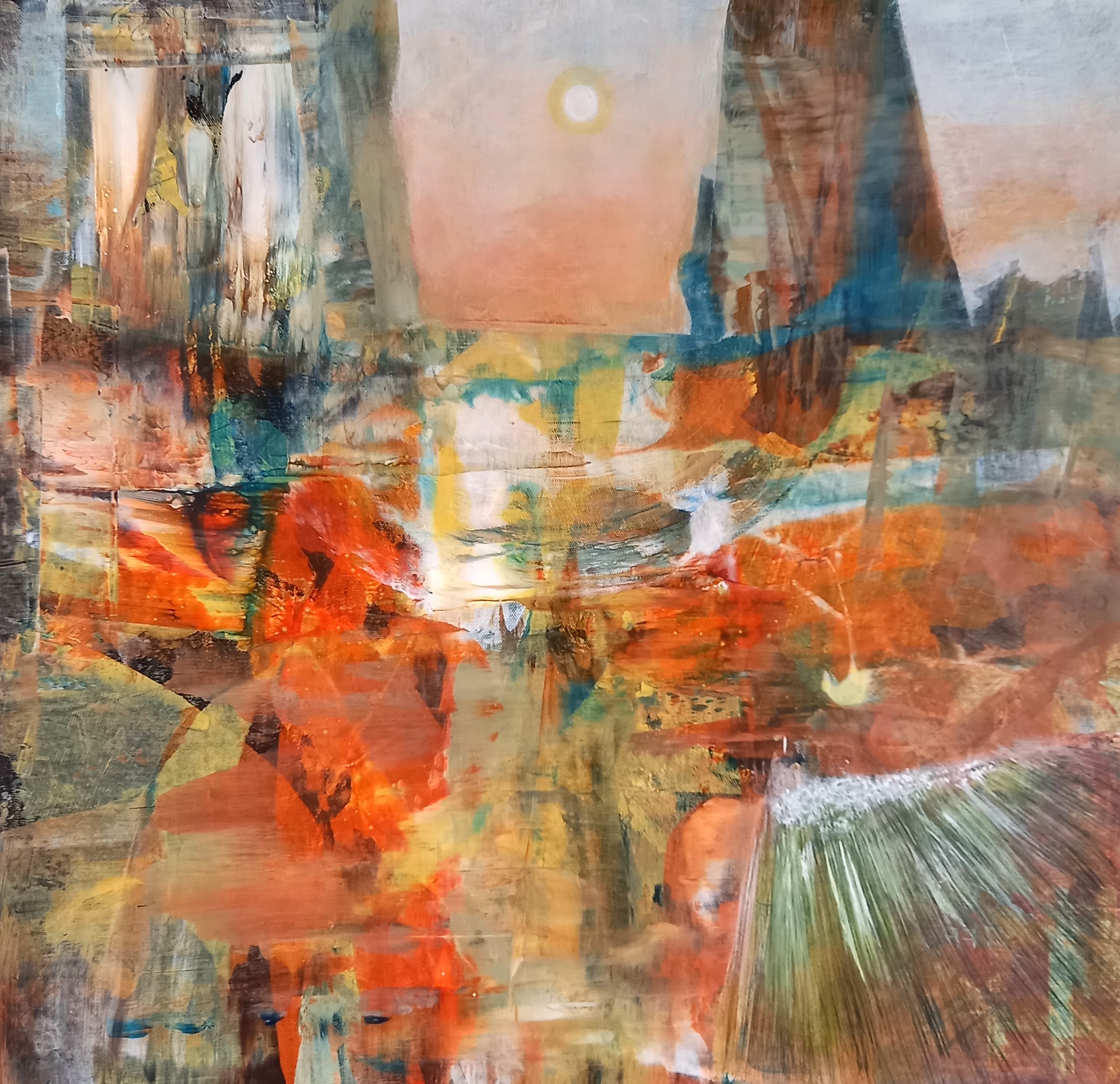 Композиция представляет собой абстрактный пейзаж, в котором едва угадываются горизонт и различные элементы земли и неба. Верхняя часть картины занята небом, выполненным в мягких пастельных оттенках розового, оранжевого и серо-голубого, что создает ощущение утреннего или вечернего солнечного света. В центре неба ярко сияет небольшой, но насыщенный круг — солнце, источник всего этого света и тепла.