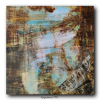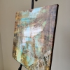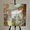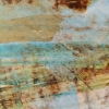 В центре и верхней части полотна можно различить угловатые, ломаные формы и горизонтальные полосы, которые могут символизировать элементы пейзажа — далёкие горы, горизонт или архитектурные фрагменты. Яркие бирюзовые пятна, словно отражения воды или неба, пробиваются сквозь более тёмные слои, создавая контраст и глубину. В левом верхнем углу видны крошечные белые точки — возможно, это птицы, улетающие вдаль, что усиливает ощущение отдалённости и тоски.