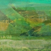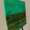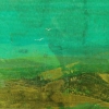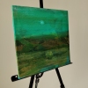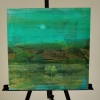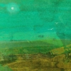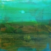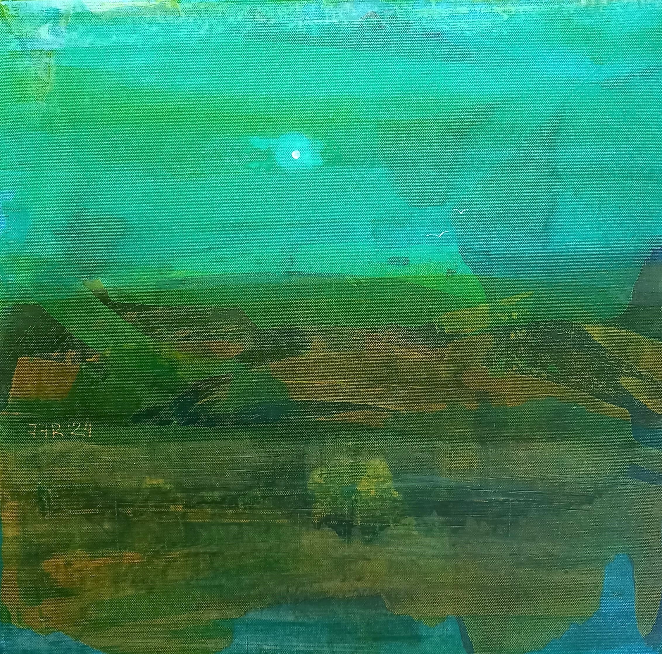 Композиция картины представляет собой горизонтальный пейзаж, разделенный на несколько планов. Верхняя часть занята небом, выполненным в прохладных, туманных оттенках бирюзового и зеленого. На этом небе сияет небольшое, но яркое белое пятно — солнце или луна, источник мягкого рассеянного света. Несколько крошечных белых точек, напоминающих птиц, придают картине ощущение простора и жизни.
