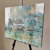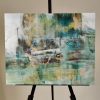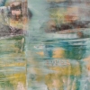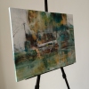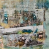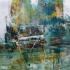 Композиция картины представляет собой сложный коллаж из пересекающихся цветовых пятен и текстур, которые, несмотря на абстрактность, намекают на городскую застройку. Доминируют приглушенные, но насыщенные оттенки зеленого, бирюзового, охристо-желтого и коричневого. Эти цвета, смешанные и наложенные друг на друга, создают ощущение старых стен, влажных улиц и отражений в лужах.