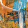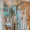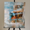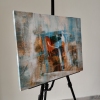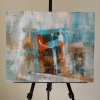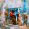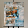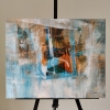 Композиция картины погружена в сложную палитру, где переплетаются теплые и холодные оттенки, создавая ощущение контраста и глубины. Доминируют насыщенные оранжевые, коричневые и землистые тона, которые создают ощущение внутренней теплоты или далекого пейзажа. Эти теплые тона резко контрастируют с яркими вспышками бирюзового, голубого и белого, которые пробиваются сквозь основные слои.