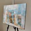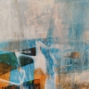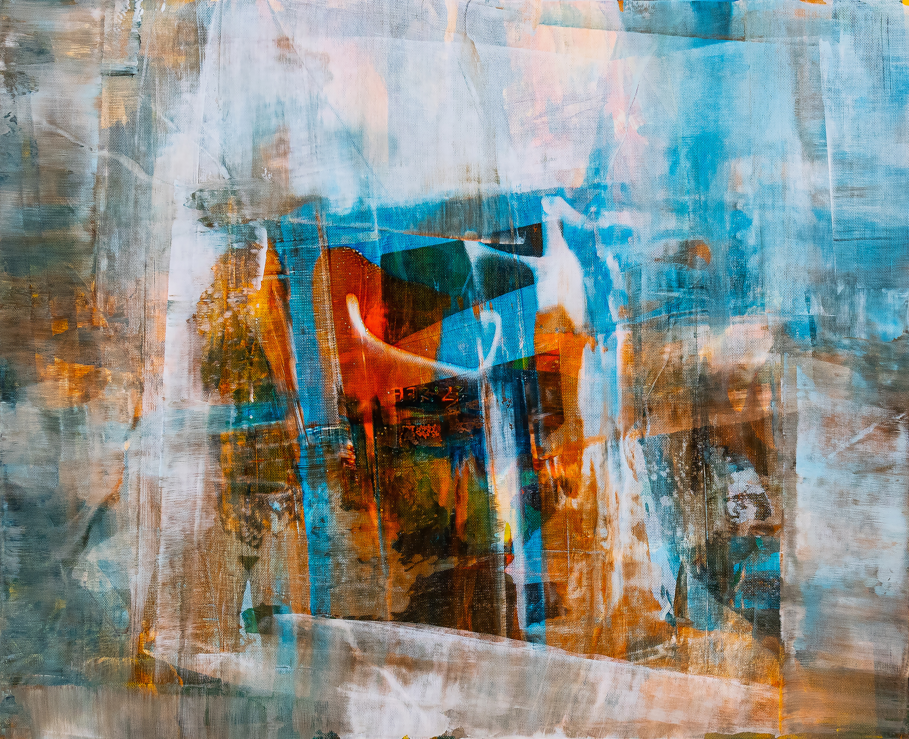 Центральным элементом является крупная угловатая форма, выполненная в ярких бирюзовых и синих тонах, которая явно напоминает оконную раму или просвет. Эта «рама» не статична: ее линии размыты, искажены, сквозь них просвечивают более темные хаотичные мазки, создавая ощущение глубины за стеклом или множества слоев, сквозь которые мы смотрим.