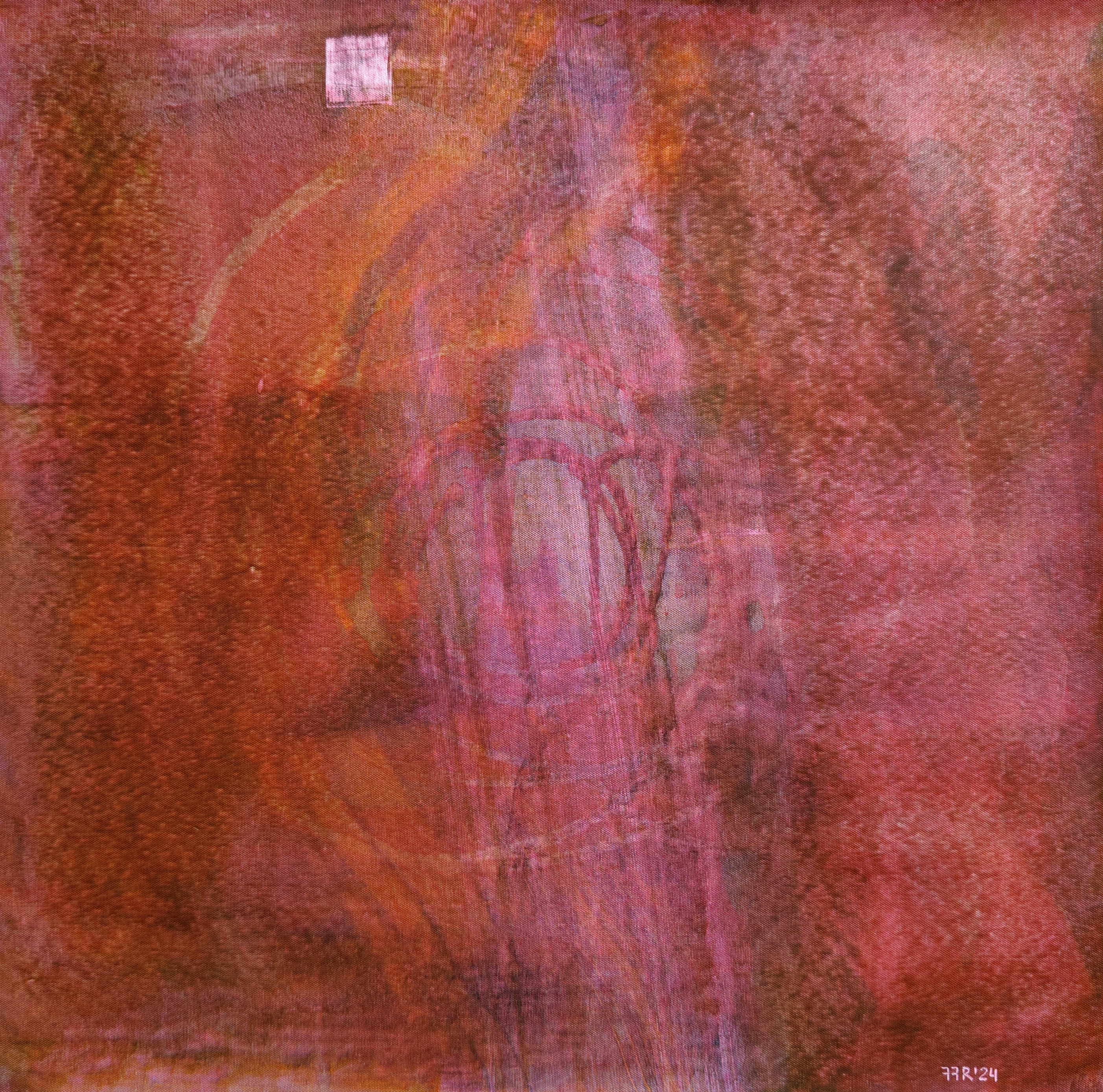 Композиция картины представляет собой многослойное цветовое поле, в котором преобладают различные оттенки красного: от насыщенного винного и бордового до более приглушенных терракотовых и кирпичных. Эти красные тона смешиваются с землисто-коричневыми, фиолетовыми, а иногда едва заметными вкраплениями оранжевого или серого. Такая палитра создает ощущение тепла, глубины, а иногда тревоги или скрытой страсти.