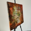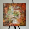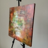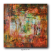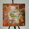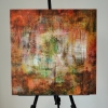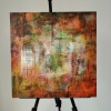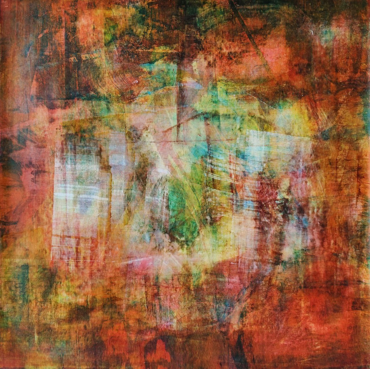 Композиция картины представляет собой плотный многослойный цветовой ковёр. Доминируют насыщенные тёплые оттенки: глубокий красный, кирпичный, оранжевый и ржаво-коричневый. Эти огненные тона создают ощущение жара, страсти, энергии или, возможно, осенней листвы. Однако это не монохром: сквозь красную пелену пробиваются участки ярко-зелёного, бирюзового и лимонно-жёлтого цветов, которые придают картине глубину и контрастность, не позволяя ей превратиться в сплошное пламя.