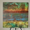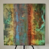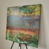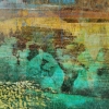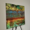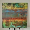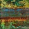 Композиция картины построена на горизонтальных цветовых полосах, которые создают ощущение слоев воды, подводных ландшафтов или пластов сознания. Преобладают глубокие зеленые, синие, бирюзовые и землисто-коричневые оттенки, которые смешиваются с теплыми охристыми и оранжевыми вкраплениями. Эта палитра создает атмосферу таинственности, влажности и переливов света под водой.