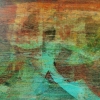В верхней части картины видны более светлые, размытые области с точечной текстурой, напоминающей солнечные блики на поверхности воды или далёкие берега. В центральной части, среди сине-зелёных и коричневых полос, можно различить смутные органические формы, которые можно интерпретировать как намёк на силуэт мужчины или русалки, погружённой в воду. Эти формы не имеют чётких границ, они текучи и переливаются, сливаясь с окружающей средой.