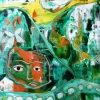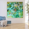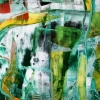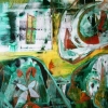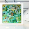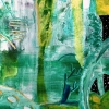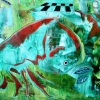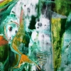 Композиция картины насыщена зелёными и бирюзовыми оттенками, которые доминируют, создавая ощущение водной среды, водорослей или подводного света. Эти прохладные тона контрастируют с тёплыми оранжевыми, жёлтыми и красноватыми акцентами, которые притягивают взгляд.