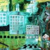 Подводный город: По всей картине разбросаны угловатые формы, напоминающие здания с окнами, мосты или другие элементы городской застройки, погруженные в зелено-бирюзовую глубину. Это создает ощущение подводного города или затонувшей цивилизации.