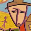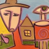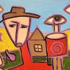 The painting centers on a family, consisting of several figures arranged in a space reminiscent of a rural landscape. The central figure, a man in a hat, seems to be the head of the family, its support and protector. His stylized face expresses calm, wisdom, and a hint of fatigue. He seems to be a symbol of reliability, stability, and care.