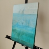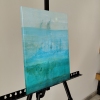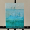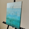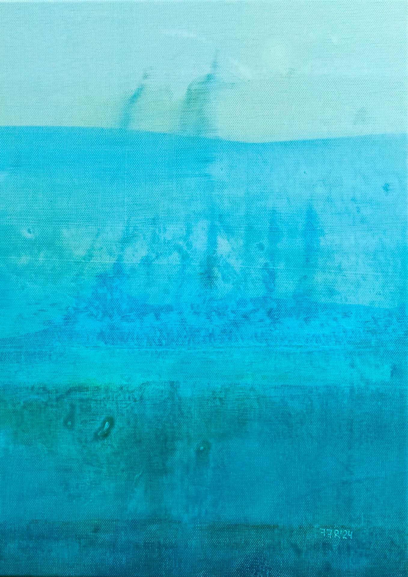 The painting, “Quiet Place,” presents an abstract landscape imbued with a sense of peace, harmony, and tranquility. The artist uses a limited palette of shades of blue and light blue to create a visual space that is associated with water, air, and infinity.