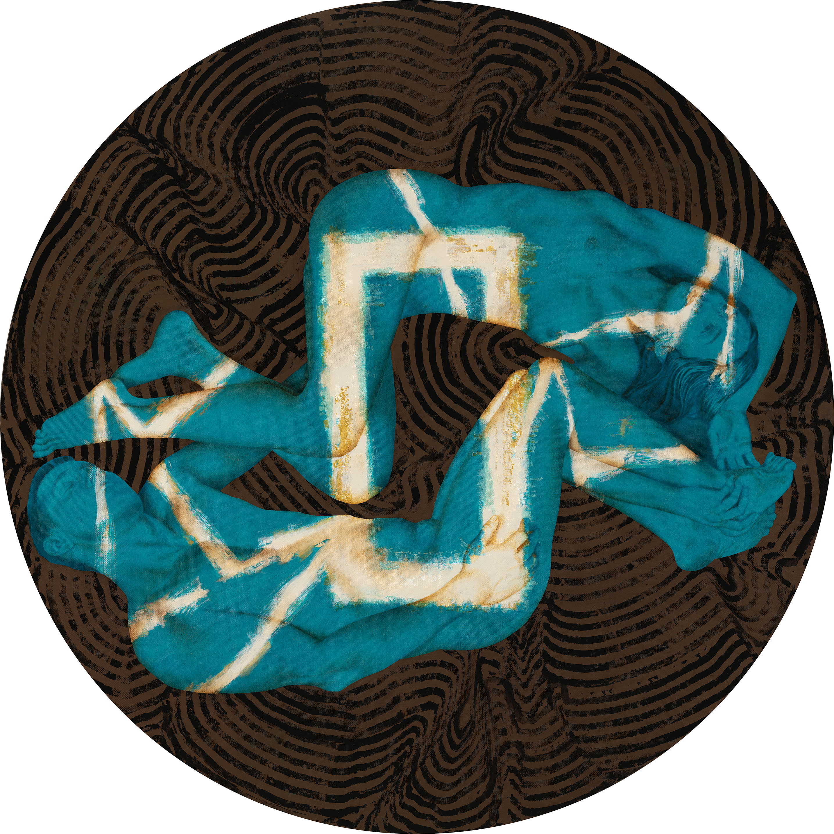 «ПОРТАЛ ДЛЯ ДВОИХ» масло на холсте, акрил, смешанная техника, диаметр 152 см. 2024. Что объединяет людей в паре? Что служит для них островом? Что притягивает их друг к другу в любых эмоциональных бурях или холодных периодах отчуждения? Вопросы, которые задают себе многие.