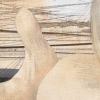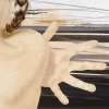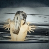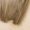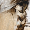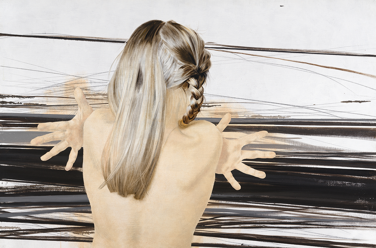 She is in the moment of “tearing out” herself from her usual environment, as if breaking out of a “cocoon”. One half of the hair on the girl's head is still braided - as a symbol of childhood, while the second is loose - a symbol of growing up. In front of the girl, we see black stripes that can symbolize the unknown