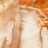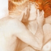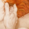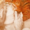 Выделяется яркий цветовой акцент, который придает сцене тепло и энергию: волосы женщины окрашены в насыщенный, огненно-рыжий цвет, который является единственным сильным цветовым пятном на фоне пастельных телесных тонов. Этот цвет символизирует страсть, огонь чувств, который движет этим моментом. Волосы мужчины, выполненные в более нейтральных рыжеватых тонах, обрамляют её голову.