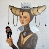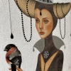 Winter is portrayed as a medieval queen.This is how I imagined winter in my childhood — majestic and austere, with a high medieval "truffo orfovre" hairstyle, and of course, a bullfinch. I thought these birds appeared only in winter, as I never saw them during the summer.