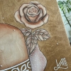 Author's technique on wood: pastel, acrylic, stain, coins.