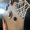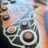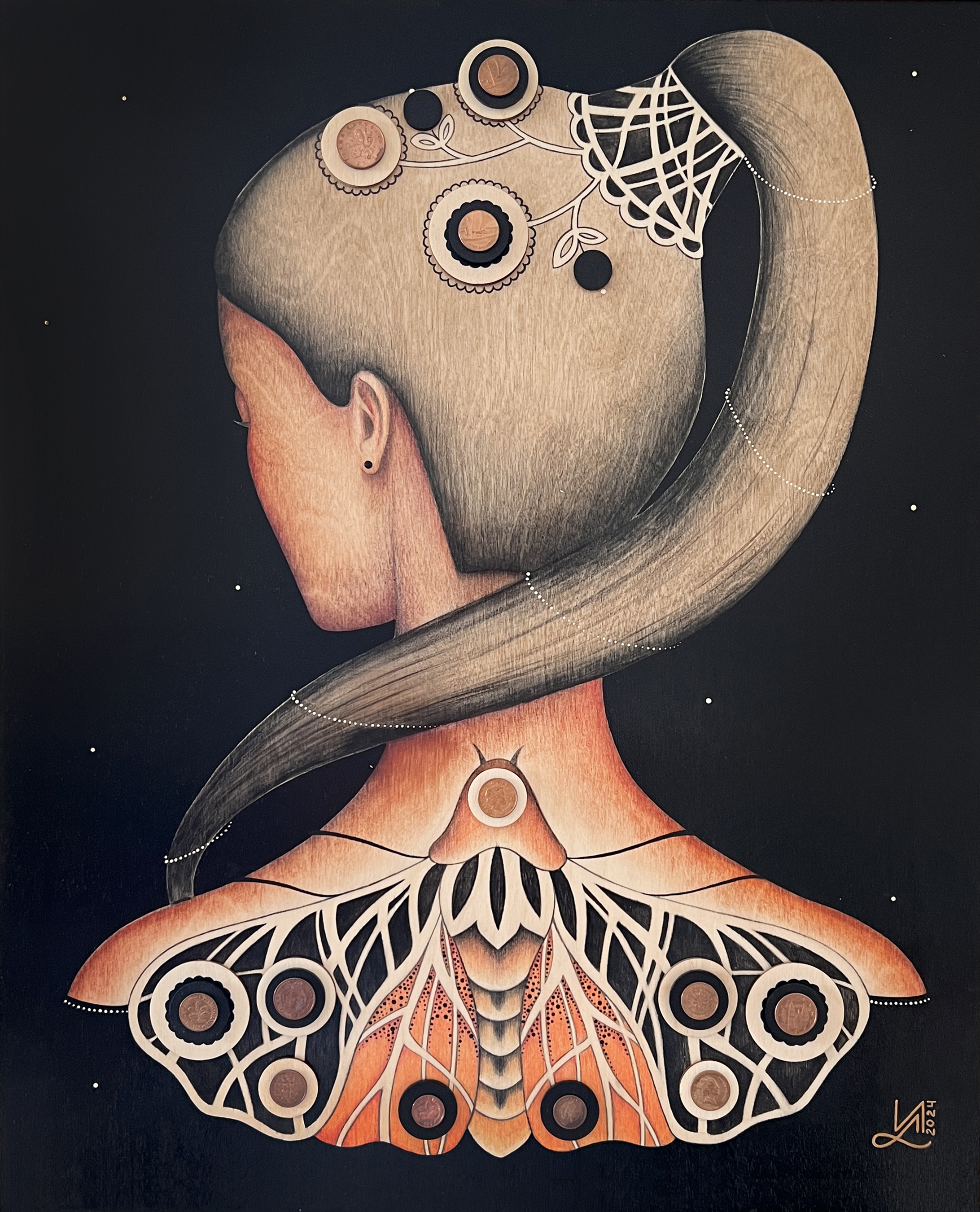 Author's technique on wood: pastel, acrylic, stain, coins, wooden elements.