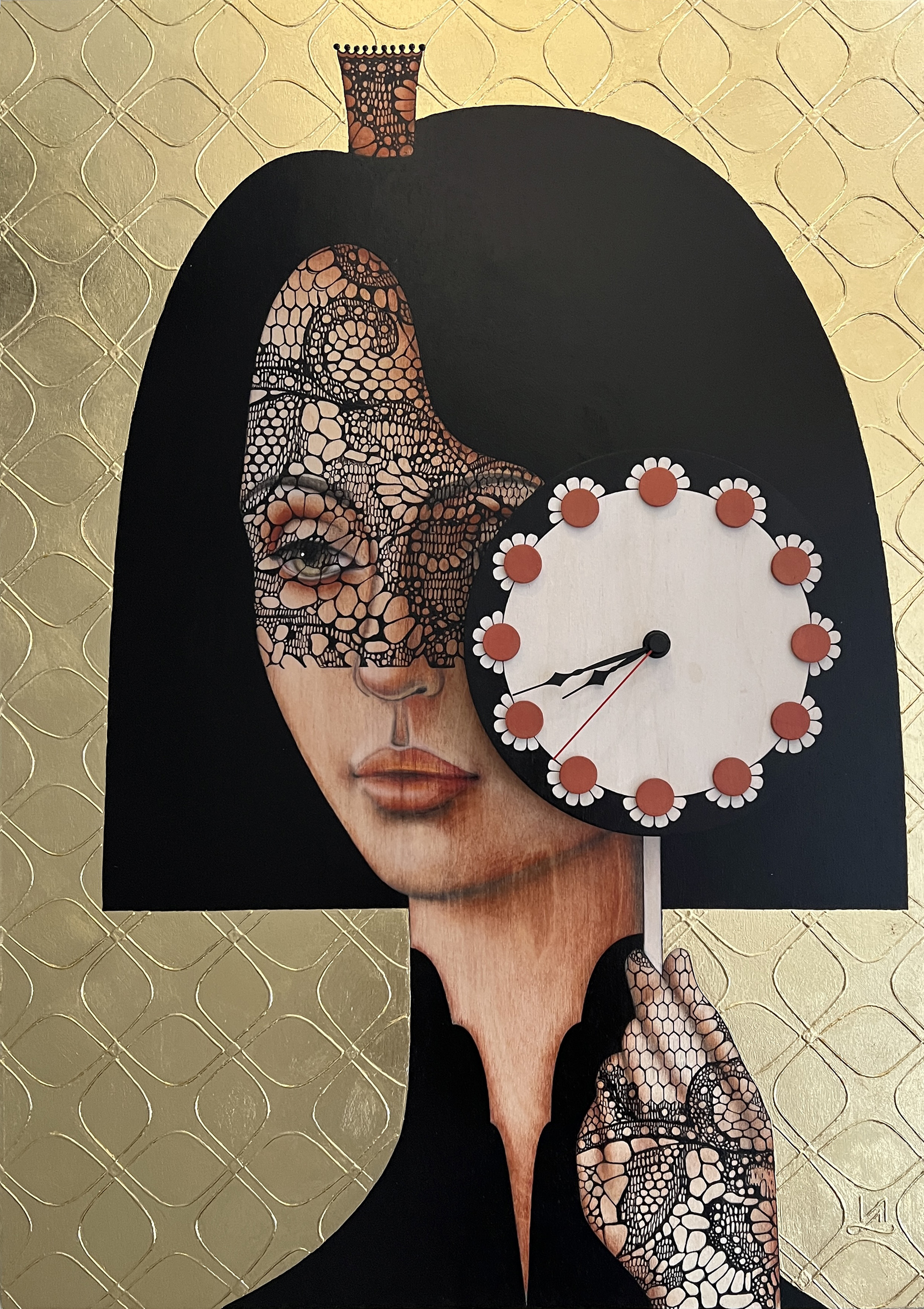 The painting «Black Queen» from the series «Keepers of Time» — is an original artwork where painting and clock mechanism merge into a meditative art object that can be admired and used as a clock.