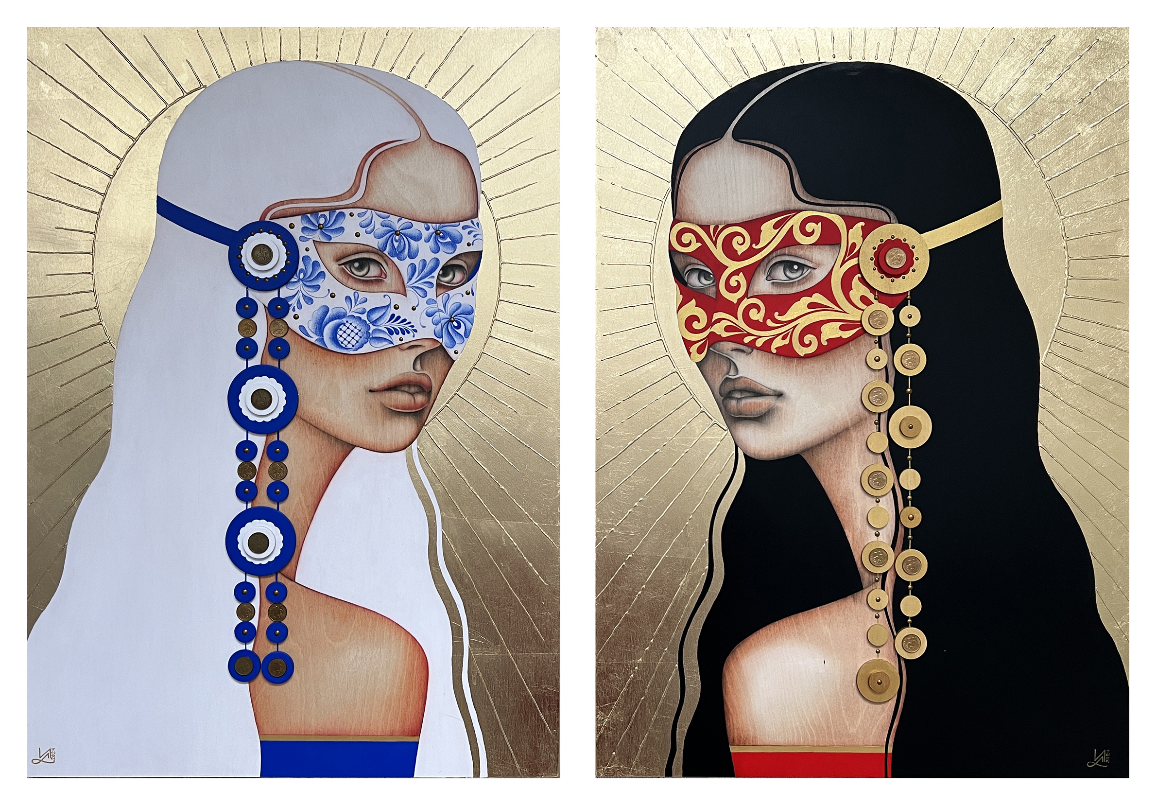 The coins in my paintings are not just decorations. They are talismans. Symbols of preservation, strength, wealth, and protection. They are woven into the portraits just as they were sewn onto headdresses and clothing in ancient times: not only for beauty but also for power. Each heroine carries the voice of the past and the breath of the present. Their images are an artistic dialogue between tradition and personal vision, between archetype and modernity.
