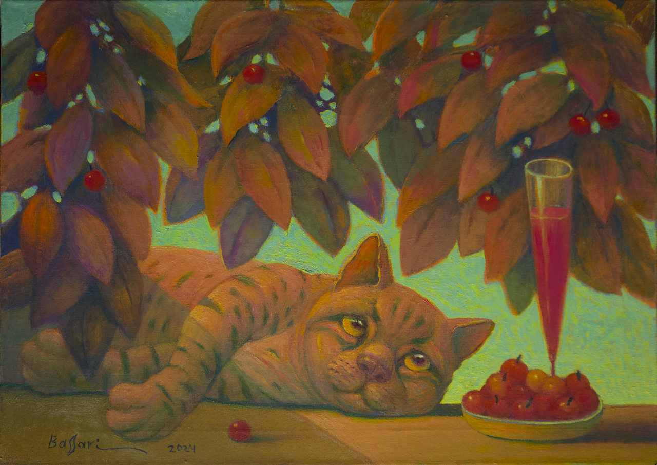 Alexander Bazarin's painting "Cat" is a warm and cozy scene, filled with peace and contemplation. Using muted yet harmonious tones and stylized forms, the artist creates an atmosphere of relaxation and tranquility, typical of a summer day in the garden. This is not simply an image of a cat lying under a cherry tree, but a visual narrative about life's small joys, its beauty, and the ability to find peace in the simplest things. The painting's focal point is a ginger tabby cat lazily stretched out on a table. His relaxed and casual pose expresses pleasure and enjoyment of the moment. The cat seems to symbolize domestic comfort, warmth, and tranquility. His gaze, directed at the viewer, expresses curiosity and a touch of irony, as if observing the bustle of the world while remaining unperturbed. The cherry tree, in whose branches the cat nestles comfortably, is a special feature of the painting. Cherries seem to symbolize summer, fertility, and joy. Their bright and juicy red fruits create a feeling of sweetness and warmth. A cat nestles in the cherry tree's branches, as if evoking its connection with the natural world around it. Beside the cat, a glass brimming with cherry juice and a saucer heaped with fresh berries can be seen.