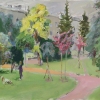 Nikolay Denisenko’s painting “Blooming in Shevchenko’s Garden” is a lyrical landscape in which the artist captures the charm of spring bloom in a city park. He uses a bright and joyful color palette and the technique of Impressionism to convey the freshness of the greenery, the play of light and shadow, and the feeling of serenity and peace inherent in a walk in nature. It is not just an image of trees, grass, and sky, but like a visual snapshot of a moment filled with life, movement, and harmony.
