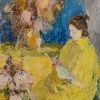 At the center of attention of the painting is the figure of a woman sitting at a table surrounded by flowers. Her pose, although relaxed, expresses concentration and enthusiasm. The artist emphasizes her inner beauty, her energy, and her immersion in the creative process. The woman’s face, executed in a rather generalized manner, expresses pensiveness and inspiration. The bright yellow color of the dress, like a ray of sunshine, illuminates her figure, adding an element of optimism and love of life to the image.