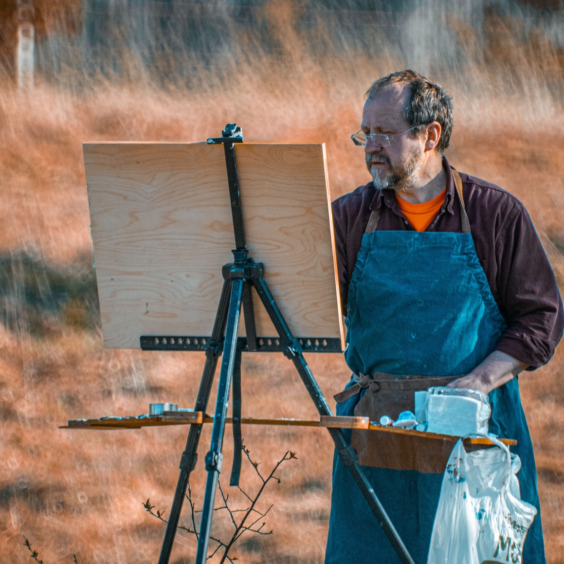 The interior of the studio, although depicted schematically, creates a feeling of a creative atmosphere and a working environment. Brushes, paints, and other art supplies scattered on the table tell about the woman’s profession and hobbies. The blue background, like the sky, stretches behind her back, creating a sense of freedom and spaciousness.