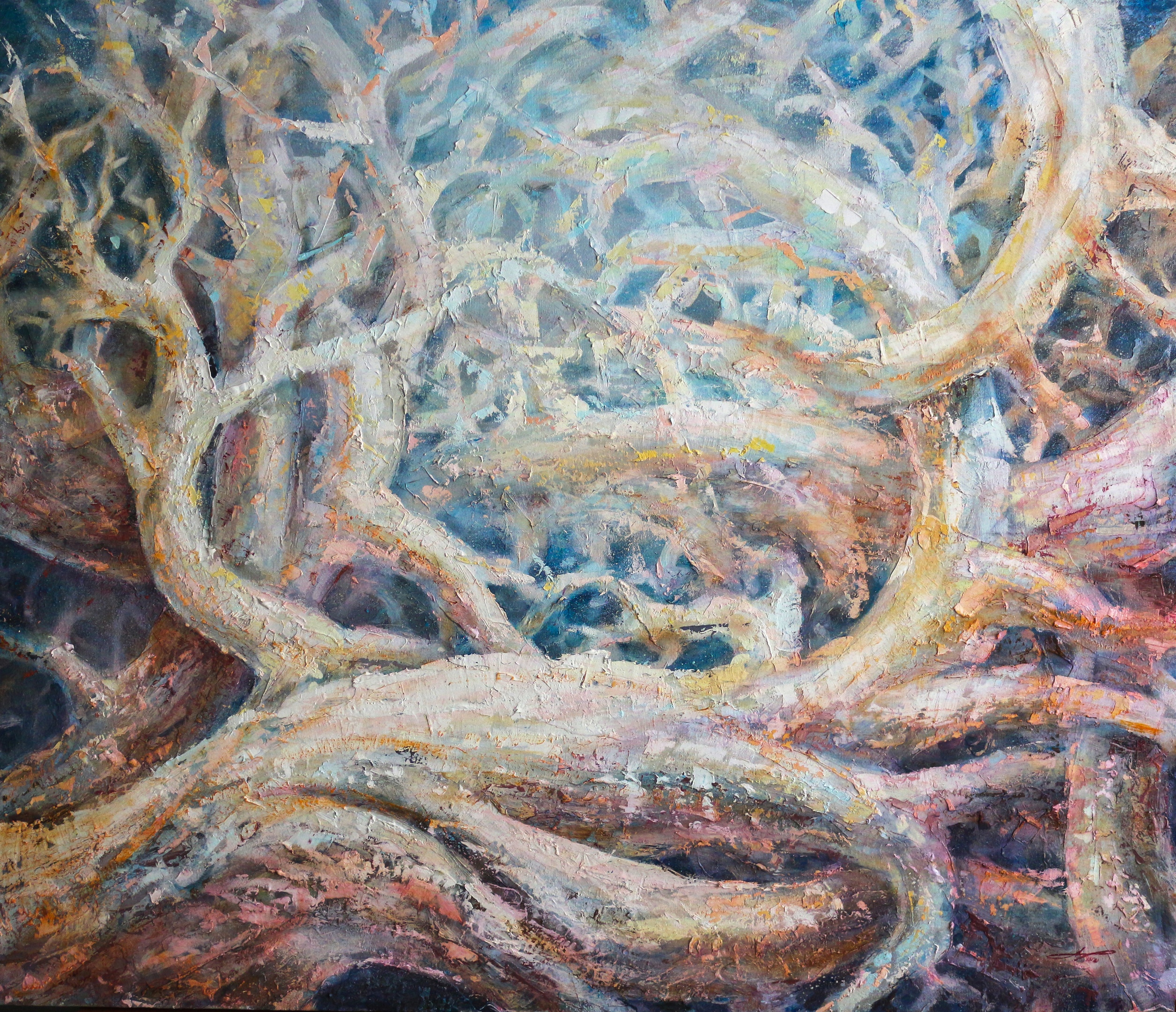 A light, almost phosphorescent palette emphasizes the living energy that permeates the roots, as if the power of the earth really flows through them. The interweaving of cold blue, warm ochre, pinkish and gray shades makes the gaze wander along the surface, opening more and more new passages into the depths of the structure. The space between the roots is filled with a mysterious glow - it illustrates the hidden connections between all living beings and the forces that nourish and support life.