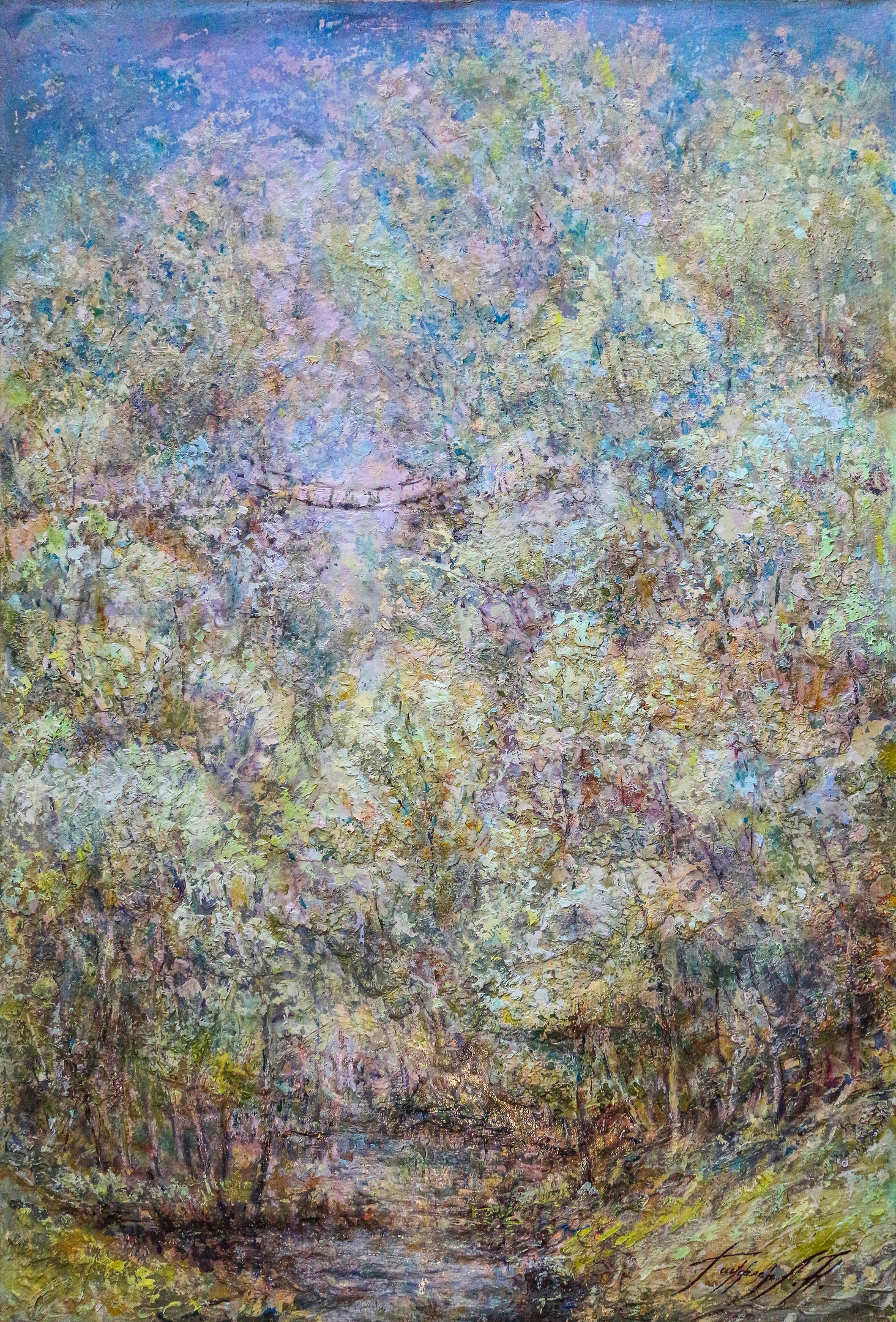 The central perspective leads the gaze into the depths of the painting, into the heart of the forest, where a path or a dry riverbed disappearing into the fog is barely discernible between the trees. The upper part of the work is filled with light, which seems to seep through the dense crowns, and the lower part is more saturated and dense in color, which creates a feeling of a reliable connection with the earth. The depicted trees seem to dissolve in a single green cloud, their borders blur, emphasizing the integrity of nature and its inner harmony. This is not just an image of a forest, but an allegory of life, eternal renewal and the cycle of time. "Greenworld" is permeated with calm, there is not a single aggressive or sharp line here - only smooth transitions, play of light and color, every detail sets the viewer up for meditative contemplation, the search for inner harmony. The subtlest elaboration of light creates the feeling that the picture radiates a soft glow, as if inviting you to linger here longer, feel the moisture of the grass, the freshness of the air, listen to the invisible sounds of nature. This work is an invitation to remember that man is inseparable from the world around him, that the real "green world" begins within, when you look at the forest not only with your eyes, but also with your heart.