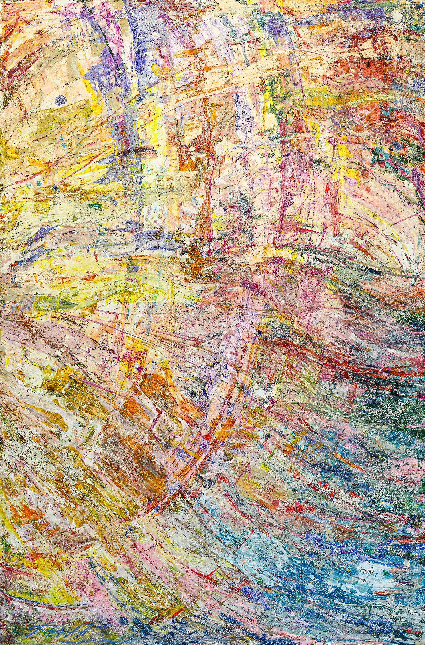 The work is dominated by soft but rich shades of yellow, terracotta, purple, blue and green, which smoothly enter into each other, creating a feeling of fluidity and constant renewal. It is this fluidity that resembles the Eastern elements of nature - wind, water