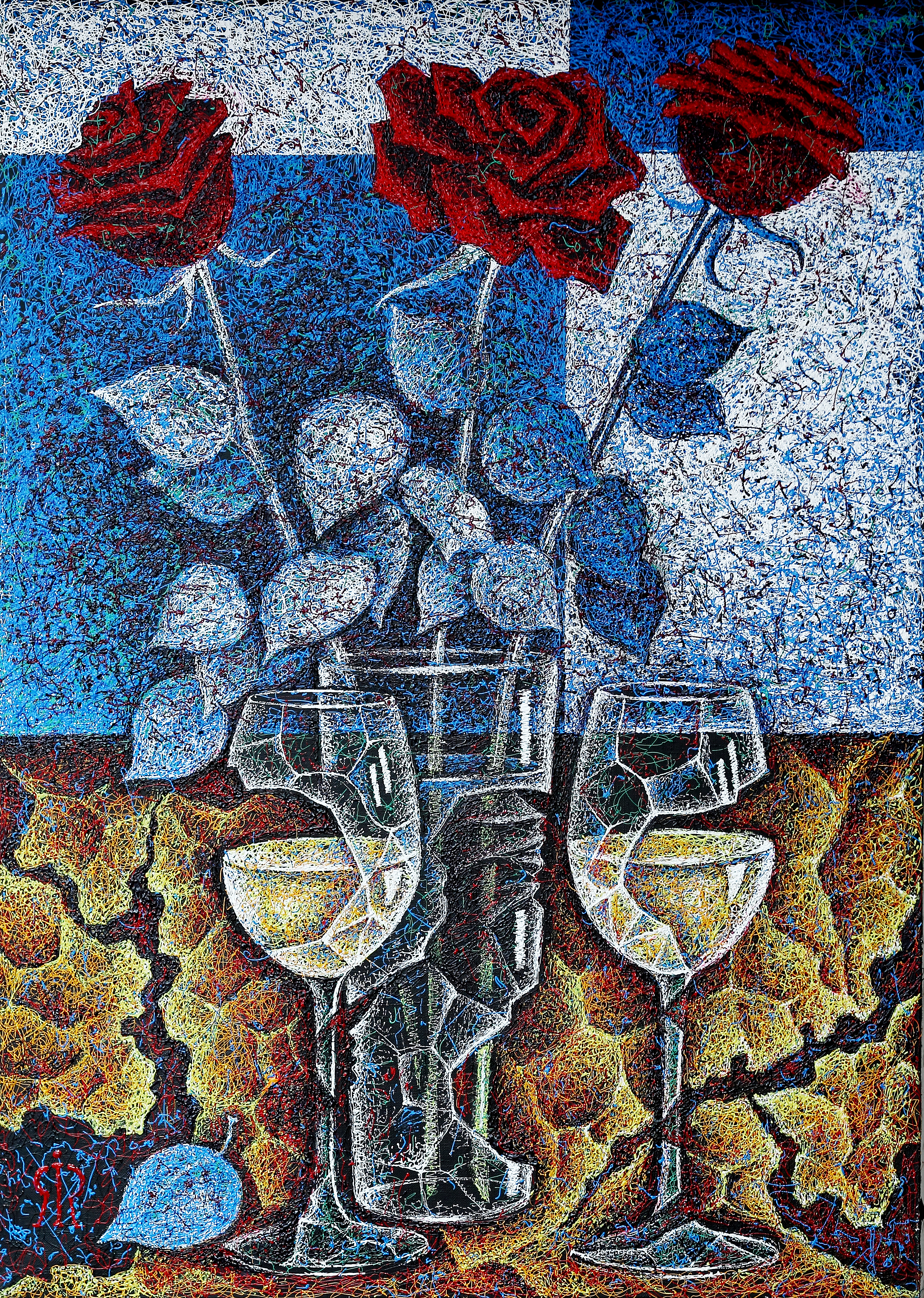 The painting is made using a unique patented technique called Filumism. The essence of the Filumism technique is to paint not with a brush, but with a syringe, squeezing paint through a needle and laying it on the surface of the canvas in the form of thin colored threads, creating a kind of non-woven acrylic tapestry. The artist uses traditional canvas, acrylic threads.