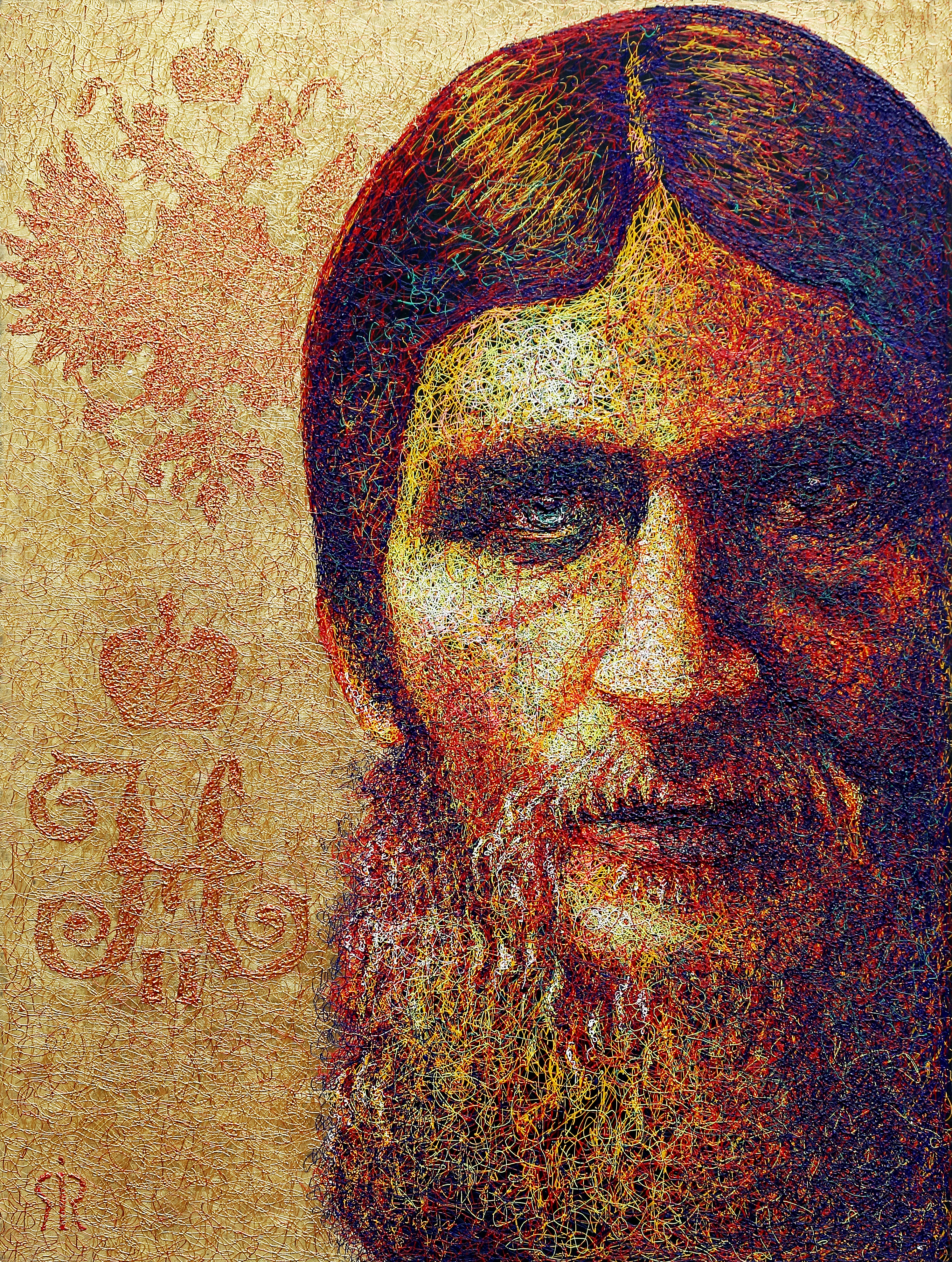 The painting is made using a unique patented technique called Filumism. The essence of the Filumism technique is to paint not with a brush, but with a syringe, squeezing paint through a needle and laying it on the surface of the canvas in the form of thin colored threads, creating a kind of non-woven acrylic tapestry. The artist uses traditional canvas, acrylic threads, gold leaf.
