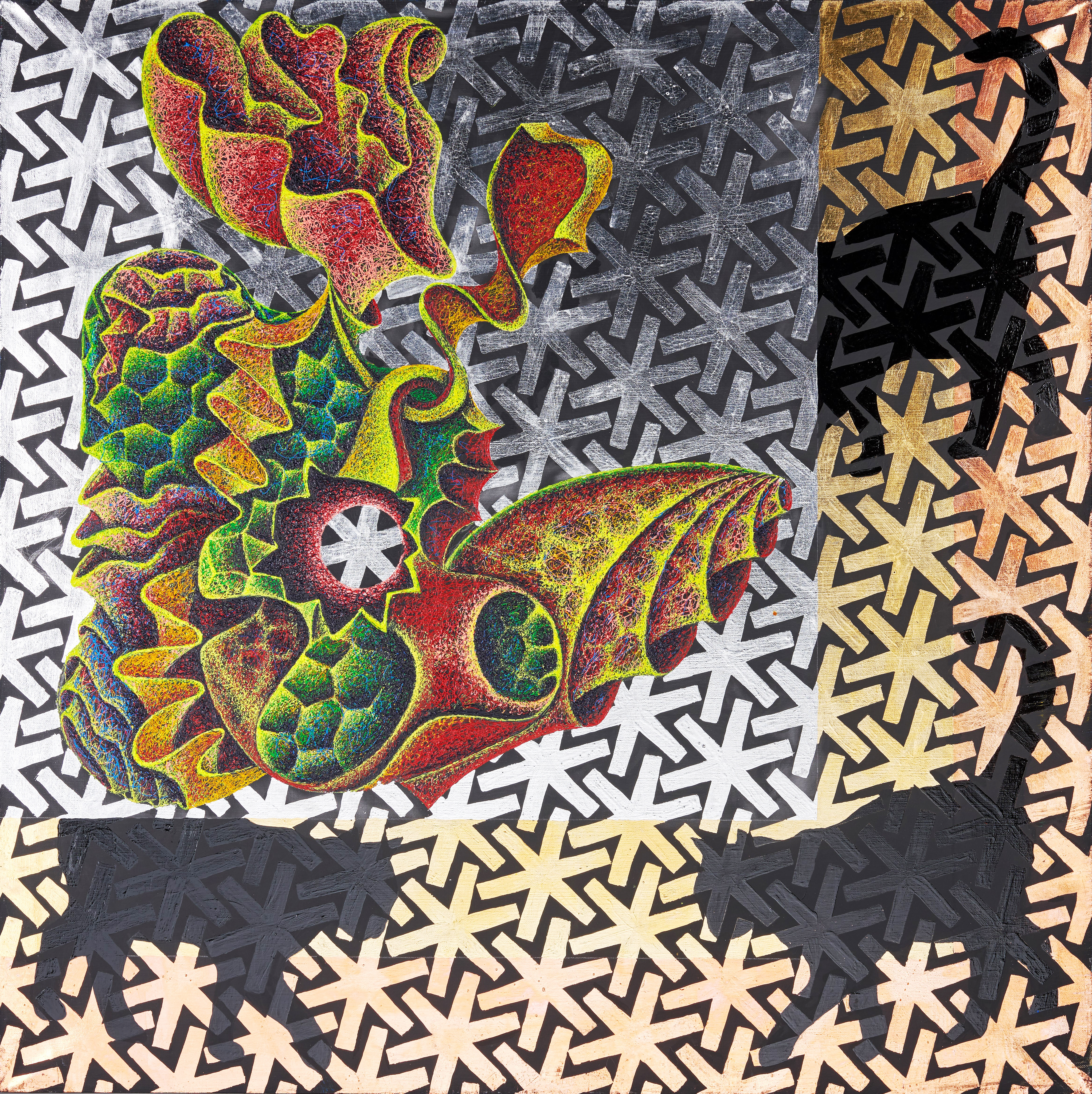 The painting is made using a unique patented technique called Filumism. The essence of the Filumism technique is to paint not with a brush, but with a syringe, squeezing paint through a needle and laying it on the surface of the canvas in the form of thin colored threads, creating a kind of non-woven acrylic tapestry. The artist uses traditional canvas, acrylic threads, gold leaf.