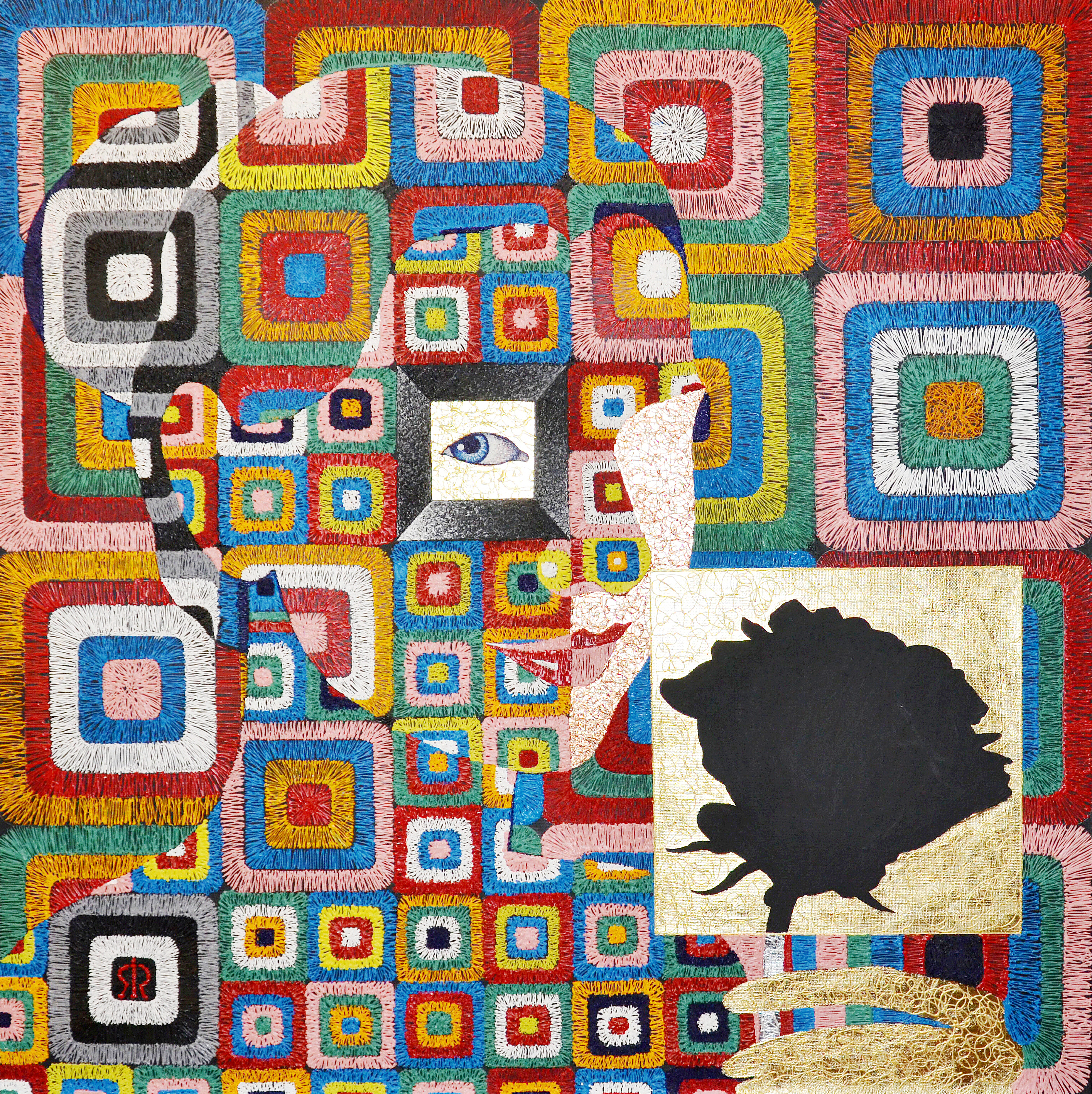 The painting "Rose fragrance. Something out of nothing" is a real paradox of visual thinking, where the sensual and rational, simple and complex, being and non-being exist simultaneously, flowing through each other, like the scent of a rose, which is impossible to see, but easy to feel. The canvas immediately captivates with the saturation of color: the background is built from many squares, each of which is filled with dense, lively strokes of bright shades. These squares form a rhythmic, almost hypnotic pattern, evoking associations with the fabric of memory or the blanket of dreams, where each motif is a separate emotion, moment or memory. However, through this bright pattern, a large silhouette of a woman's profile appears - as if transparent, not fully revealed, like a trace on glass or imagination. The boundaries of the figure are emphasized softly, inside it remains part of this common color field - in itself, it seems to be nothing, but thanks to this "nothing" a feeling of presence, individuality, life arises. The only specific element inside the head is the eye, enclosed in a perfect square frame, referring to the window of the soul or the emphasis on awareness, observation, the inner light of thought. The gaze is directed forward, as if inviting the viewer to look deep inside, to walk through the labyrinth of memories and meanings.
